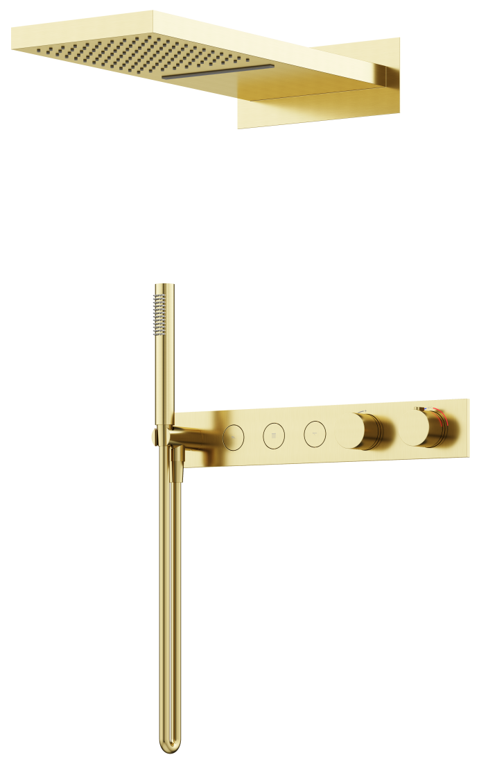 Комплект для душа с термостатом; Надежный корпус из высококачественной латуни; Термостат со высокочувствительным катриджем SEDAL (Испания) мгновенно настраивает желаемую температуру воды; Предустановленный ограничитель температуры при 40°; Система защиты от ожогов при отключении холодной воды; Встроенный клапан защиты от обратного потока:; Встроенный девиатор автоматически переключает поток с верхнего душа на ручной при выключении воды. Кнопочное управление режимами верхнего душа и источниками воды. Ручной душ из латуни со шлангом из ПВХ с системой защиты от перекручивания, длина 1,5 м. Верхний душ из нержавеюшей стали; Верхний душ - 2 режима (каскадный и тропический); Экстра прочное покрытие PVD; цвет брашированное золото