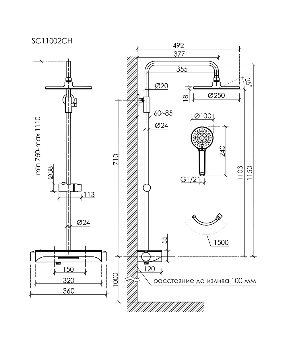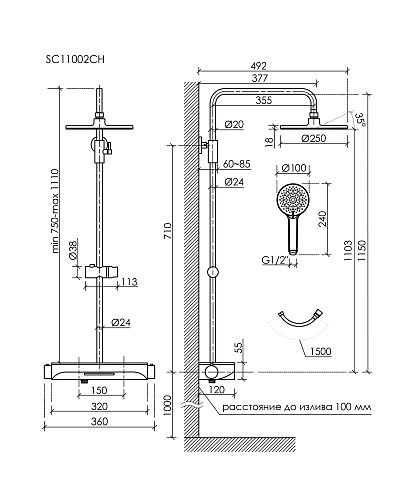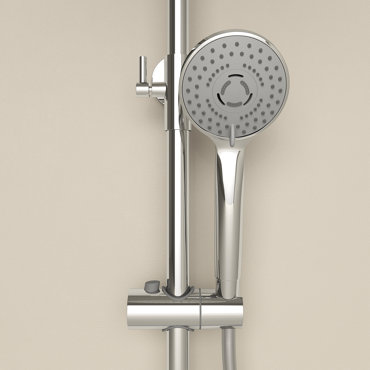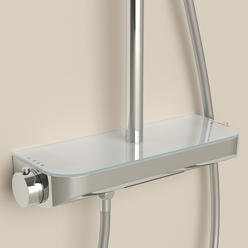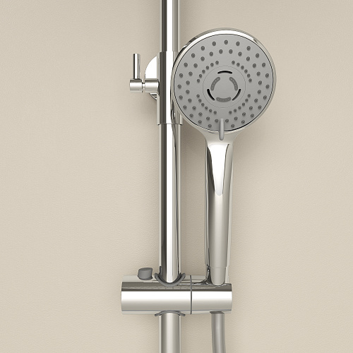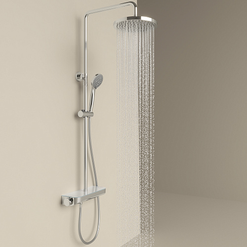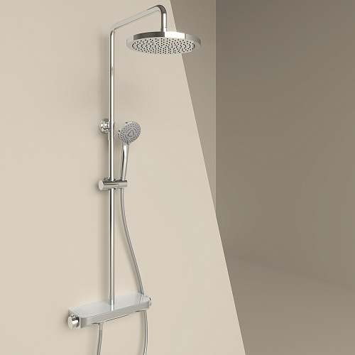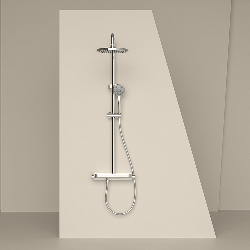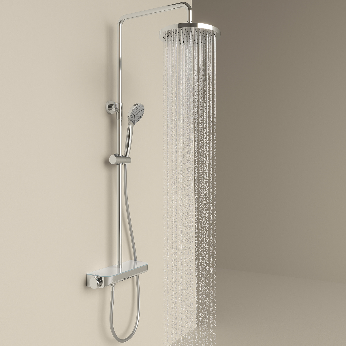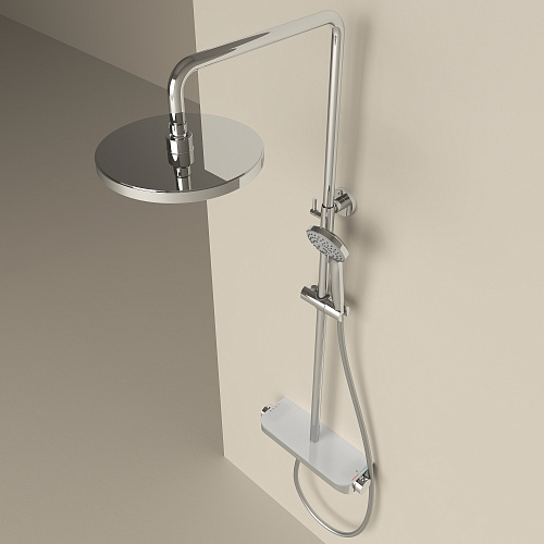 Для установки в душевую зону Регулировка штанги по высоте от 750 - 1 110 мм Смеситель с термостатом, встроенным изливом, полкой из закаленного стекла Встроенный дивертер для переключения между верхним, ручным душем и изливом Верхний душ ø250 мм с регулировкой наклона, поток воды 19 л/мин Ручной душ ø100 мм, 3 режима, поток воды 13 л/мин Шланг из ПВХ с системой защиты от перекручивания, длина 1500 мм Прочное покрытие методом электроплейтинга