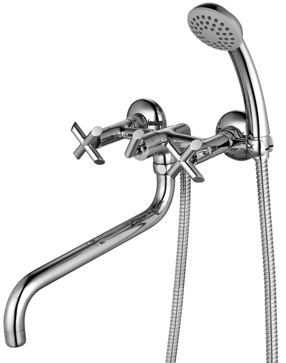 Серия PRACTICA. Комплектация: - Аэратор - Кран-буксы с керамическими пластинами (угол поворота – 90 градусов) - Переключатель с керамическими пластинами - Аксессуары в комплекте: шланг 1,5 м, 1-функциональная лейка ?66 мм - Металлические рукоятки