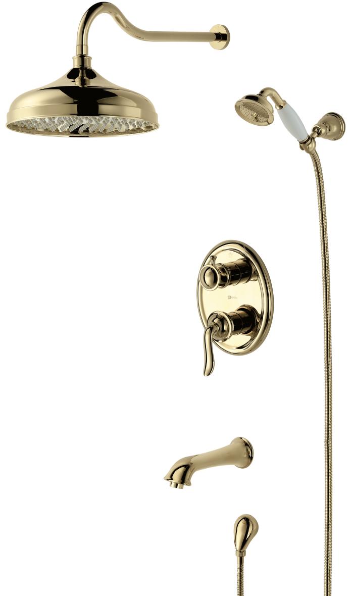 Серия BRAVA - это отражение благополучия в золотом глянце. Комплектация: - Встраиваемый наполнитель для ванны с аэратором Neoperl® Cascade® - Эко-картридж Sedal® 35 мм - Трехпозиционный картриджный переключатель - Верхняя поворотная душевая лейка «Тропический дождь» ?303 мм - 1-функциональная лейка ?66 мм - Настенное поворотное крепление для лейки - Душевой шланг 2 м - Подключение для душевого шланга - Металлическая рукоятка