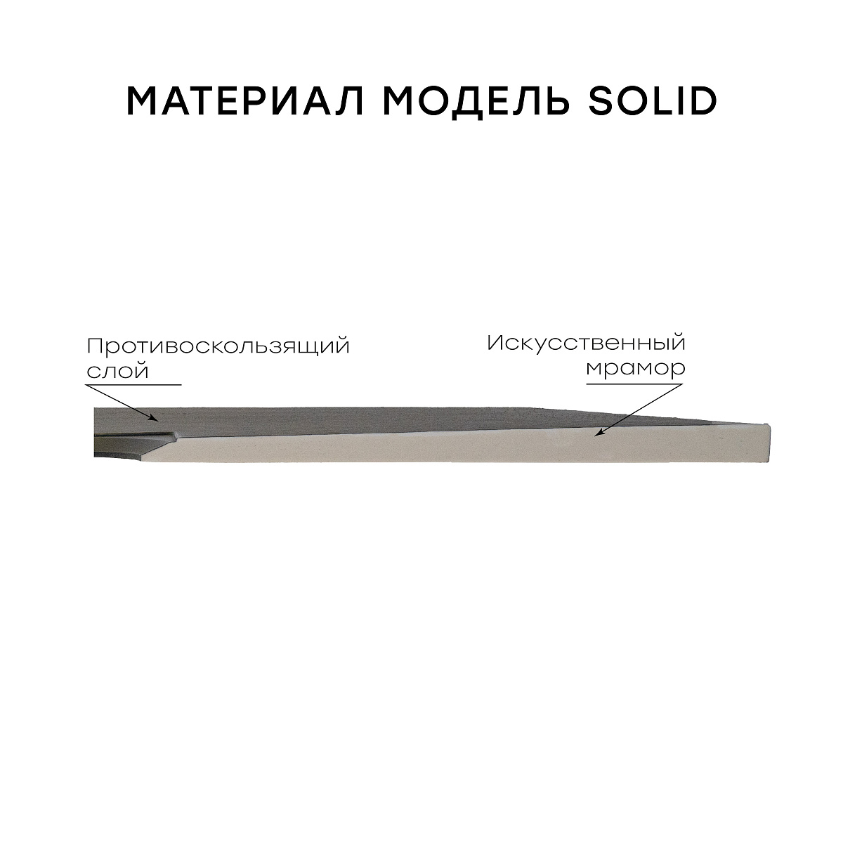 Душевой поддон Solid изготовлен из искусственного мрамора и представляет собой монолитный материал на 85% состоящий из мраморной крошки, минеральных пигментов и связывающего материала в виде полиэфирной смолы. Сверху материал покрывается гелевым слоем SUNILUX. SUNILUX — это запатентованное высокопрочное гелькоут покрытие, абсолютно непористый материал, защищающий поддон от загрязнений, перепада температур и УФ-излучения. Душевые поддоны Solid производятся на современном европейском оборудовании для европейского рынка. Контроль качества осуществляется на всех этапах производства. Нескользящая поверхность Antislip R12 Поверхность с имитацией сланца Прочный (выдерживает вес свыше 300 кг) Высокая износостойкость Стойкий к перепадам температур Стойкий к воздействию химических веществ Устойчивый к загрязнениям Не меняет цвет от времени Экологически нейтральный материал Теплый на ощупь, приятный тактильный эффект Хорошее шумопоглощение (в отличие от стали и акрила) Легко моется с использованием бытовых моющих средств Возможность подрезки под индивидуальный размер Гарантия 3 года *
