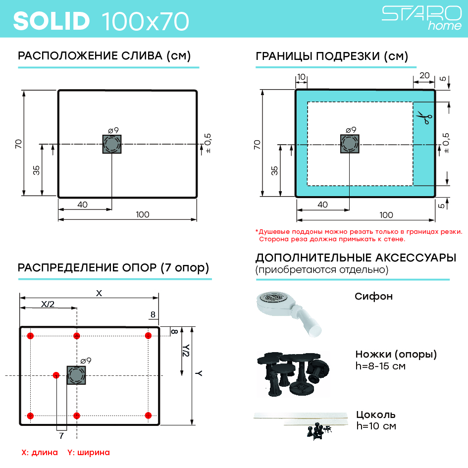 Душевой поддон Solid изготовлен из искусственного мрамора и представляет собой монолитный материал на 85% состоящий из мраморной крошки, минеральных пигментов и связывающего материала в виде полиэфирной смолы. Сверху материал покрывается гелевым слоем SUNILUX. SUNILUX — это запатентованное высокопрочное гелькоут покрытие, абсолютно непористый материал, защищающий поддон от загрязнений, перепада температур и УФ-излучения. Душевые поддоны Solid производятся на современном европейском оборудовании для европейского рынка. Контроль качества осуществляется на всех этапах производства. Нескользящая поверхность Antislip R12 Поверхность с имитацией сланца Прочный (выдерживает вес свыше 300 кг) Высокая износостойкость Стойкий к перепадам температур Стойкий к воздействию химических веществ Устойчивый к загрязнениям Не меняет цвет от времени Экологически нейтральный материал Теплый на ощупь, приятный тактильный эффект Хорошее шумопоглощение (в отличие от стали и акрила) Легко моется с использованием бытовых моющих средств Возможность подрезки под индивидуальный размер Гарантия 3 года *