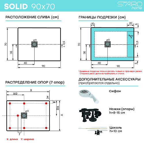 Душевой поддон Solid изготовлен из искусственного мрамора и представляет собой монолитный материал на 85% состоящий из мраморной крошки, минеральных пигментов и связывающего материала в виде полиэфирной смолы. Сверху материал покрывается гелевым слоем SUNILUX. SUNILUX — это запатентованное высокопрочное гелькоут покрытие, абсолютно непористый материал, защищающий поддон от загрязнений, перепада температур и УФ-излучения. Душевые поддоны Solid производятся на современном европейском оборудовании для европейского рынка. Контроль качества осуществляется на всех этапах производства. Нескользящая поверхность Antislip R12 Поверхность с имитацией сланца Прочный (выдерживает вес свыше 300 кг) Высокая износостойкость Стойкий к перепадам температур Стойкий к воздействию химических веществ Устойчивый к загрязнениям Не меняет цвет от времени Экологически нейтральный материал Теплый на ощупь, приятный тактильный эффект Хорошее шумопоглощение (в отличие от стали и акрила) Легко моется с использованием бытовых моющих средств Возможность подрезки под индивидуальный размер Гарантия 3 года *