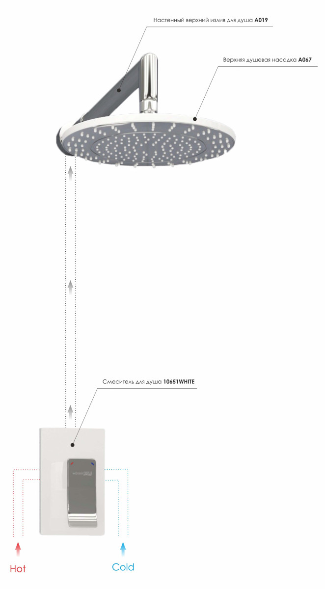 Оснащение Смеситель для душа Aller 10651WHITE, Верхняя душевая насадка A067, Верхний излив для душа A019