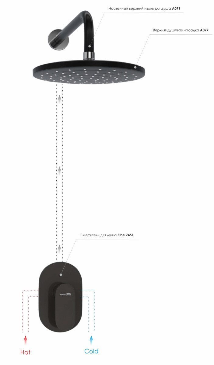 Оснащение Смеситель для душа Elbe 7451 , Верхняя душевая насадка A077 , Настенный верхний излив для душа A079