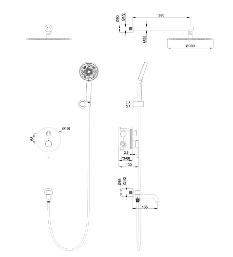 Оснащение Смеситель / Душевой шланг/ Держатель для душа / Верхний душ / Душевая лейка / Эксцентрики / Монтажный комплект